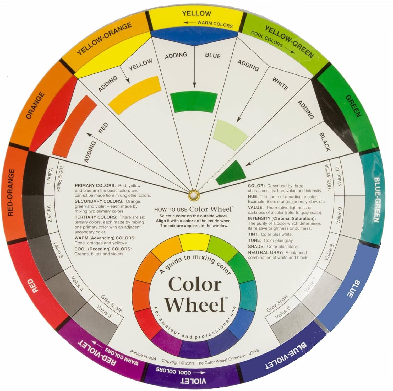 A color wheel comprises three pieces of double sided cardboard with a pin at the centre that turn to provide specific information about color patterns / combinations. It is by far the easiest and quickest way to understand how colors relate to each other.