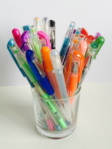 Gel Pens are pens that use a water-based gel containing various pigments. The ink is slightly thicker, usually flows more smoothly and is wetter than the typical ink used in a ball point pen. In addition to the pigments some gel inks contain glitters of various sizes to add sparkly or metallic effects to the ink. Gel pens come in a wide variety of vibrant colours and ink styles and so have become quite popular amongst the adult coloring community. The variety of Gel Pens available now is huge. Due to the ink styles available, Gel Pens can add a range of different effects to your adult coloring pictures. There are broadly six different styles of gel pen inks: classic, glitter, metallic, neon, pastel, swirl.