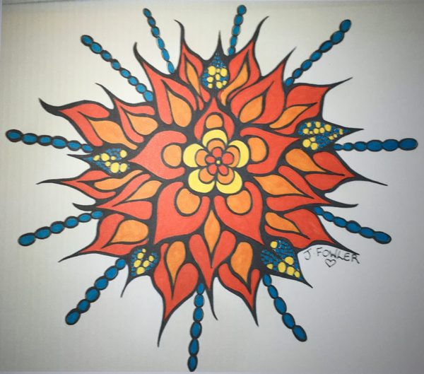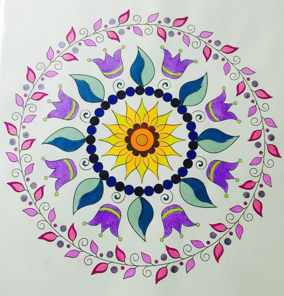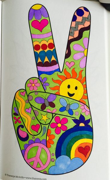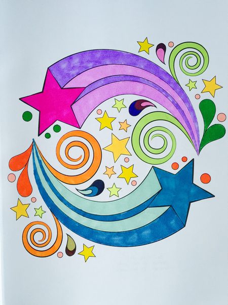 Hand Giving Peace Sign covered with patterns and colored with variety of colors One large blue star and one large pink star each with colorful trails and miscellaneous colored smaller stars Mandala Style using Colored Tulips Brightly colored yellow and orange flower with blue stems
